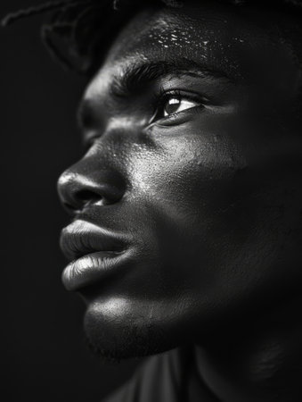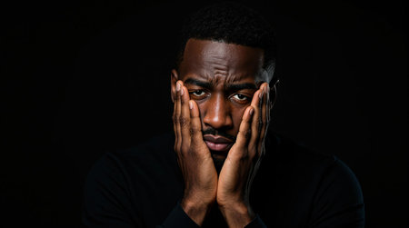 Pensive black man contemplating in dark background.