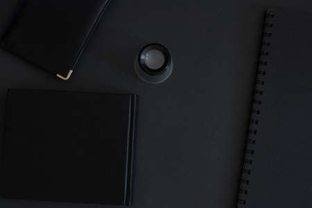Dark stylish workplace with notebook and pen on black leather desk background