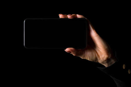 Person holding in hand mobile phone in horizontal orientation with empty screen