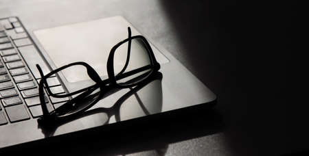 shadow falls on an open laptop on which reading glasses lie. selective focus