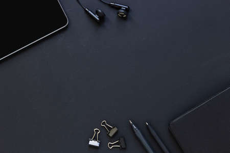 Top view flat lay of business working place. Empty workspace on table. Black minimalism.