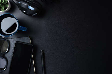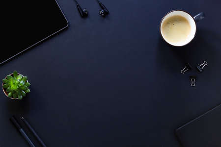 Top view of dark modern workplace with office supplies, coffee cup, decorations and copy space on black table