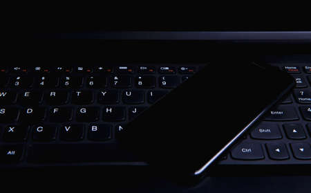 Black smartphone, keyboard, camera on a black background. Business matters. Discreet photography. Free space for text.
