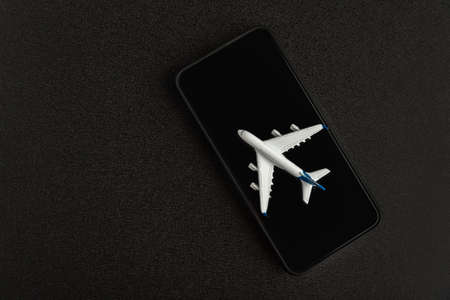 Model airplane on smartphone on black background. Application for searching airtickets