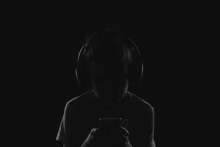 profile of a child in headphones looking at a phone in complete darkness