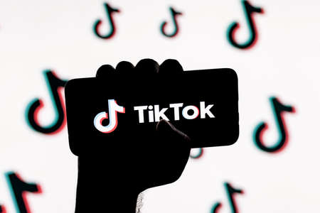 Kazan, Russia - Oct 31, 2021: Smartphone with the TikTok social network logo on the screen in a clenched hand on the background of TikTok logos