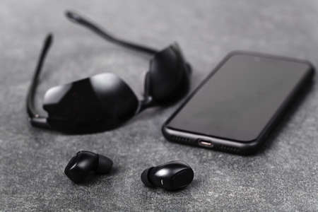 Accessories for men's beauty on a monochromatic background. black pen, black smart watch, smartphone and wireless headphones on dark background. View from above. Minimalist black trend 2020.
