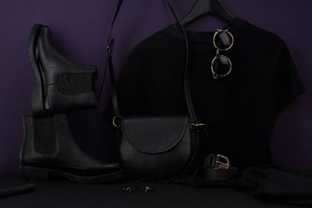 Fashion accessories, chelsea boots, leather bag and t-shirt dress arranged in dark-coloured still life composition