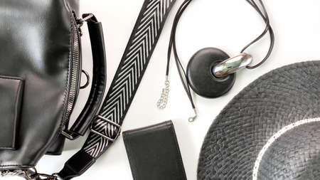 Fashion concept. Black elegant womans accessorize, isolated on white background. Top view.