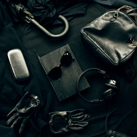 Black monochromatic flatlay on black background. Clothes, accessories and beauty equipment. Black friday sale concept. Copy space