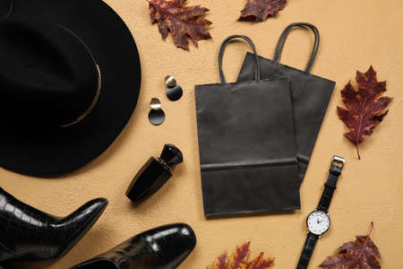 Stylish female accessories, paper bags and dry leaves on color background, closeup. black friday sale