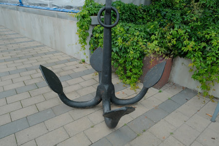 An old black anchor lies on the sidewalk.