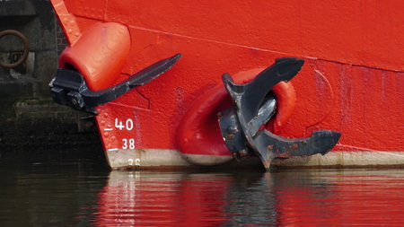 Ship's bow with a red and white hull, flanked by two large anchors on chains close-up. Vessel is docked on dry land for maintenance