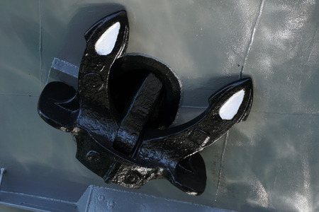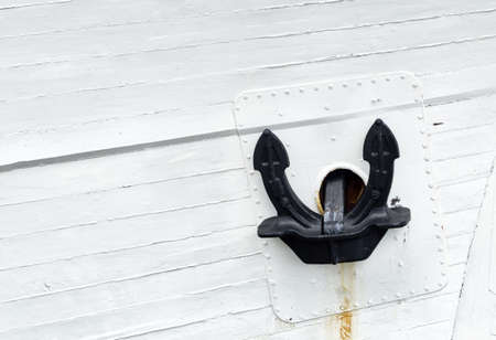 Close up of a black mooring anchor on white painted ship's side.