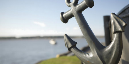 A detailed image of a gray metal anchor against the backdrop of a calm river and boats.