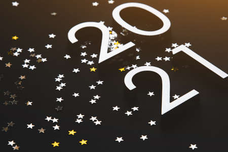 silver metal numbers 2021 and stars on black background.