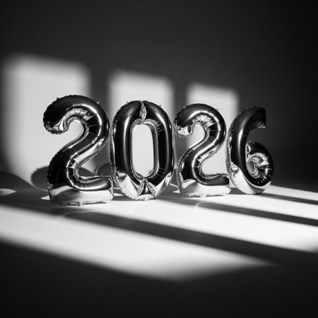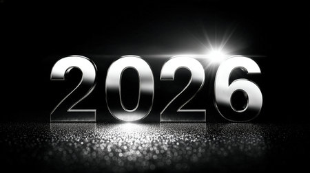 Shiny metal numbers 2026 sit on a smooth surface reflecting soft warm lights in the background symbolizing celebration and new beginnings.