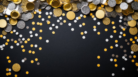 A vibrant arrangement of colorful confetti including gold, silver, and white circles on a dark background, perfect for festive celebrations or events.