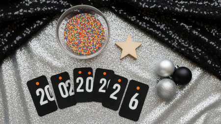 A top view flat lay for the New Year 2026 featuring number cards, a bowl of sprinkles, a wooden star, and ornaments on a black and silver sequin fabric.