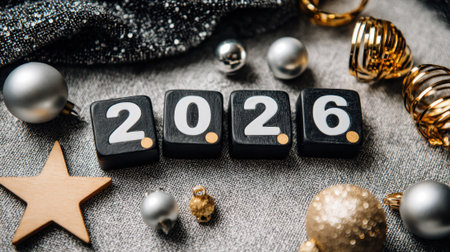 A festive arrangement of the year 2026 spelled out with blocks, surrounded by sparkling ornaments and a wooden star, symbolizing the upcoming New Year.