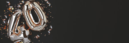 Banner with number fourty golden balloons and confetti on a black background.