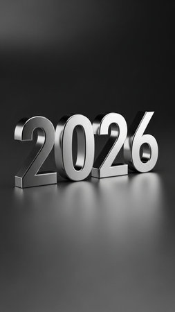 Metallic 3D numbers of the year 2026 on a dark reflective surface Clear details and vibrant color...