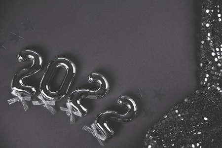 Christmas decoration with silver toys, stars, balls and 2022 numbers. Top view.