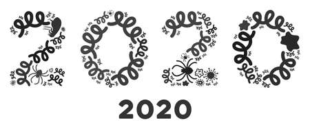 Vector virus 2020 year text icon collage of contagious microbes. 2020 year text mosaic is constructed with virus elements, parasites, microbes, spores, contagious agents,