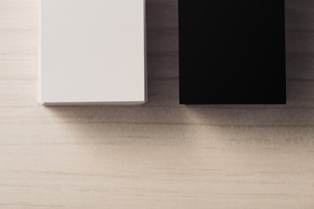 Two wooden game pieces one light and the other dark are positioned facing each other on a smooth surface creating a thoughtful contrast.