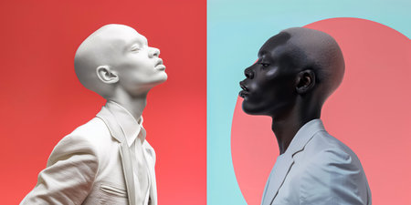 This image showcases two stylized portraits with contrasting lighting and coloration. Each character faces opposite directions against vibrant backgrounds