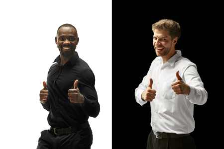 The success happy afro and caucasian men. Mixed couple. Dynamic image of male models on white and black studio. Human facial emotions concept.