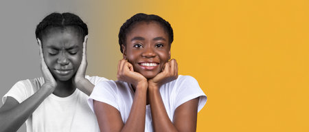 Happy, confident and unhappy serious millennial black lady