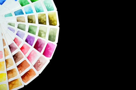 Watercolor color palette on white paper, fanned out. On a black background. A table of different shades of colors for mixing and matching, an empty space for text.