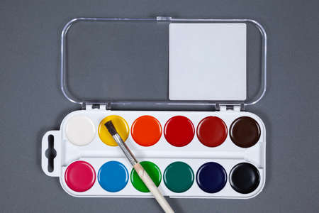 Palette of watercolor paints on a gray background