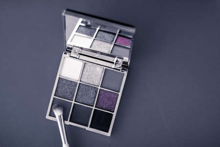 Cosmetic branding, mua and girly concept - Eyeshadow palette and make-up brush on graphite background, eye shadows cosmetics product for luxury beauty brand promotion and holiday fashion blog design
