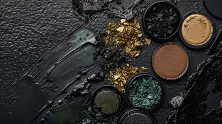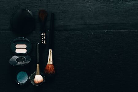 Eye shades and brushes on the left side of a black background - Minimalist flat lay with cosmetics on dark stone textured surface - Concept image for woman beauty