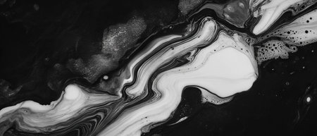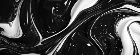 Abstract fluid art background featuring bold black and white swirls, creating a striking monochromatic pattern with high contrast and dynamic movement.