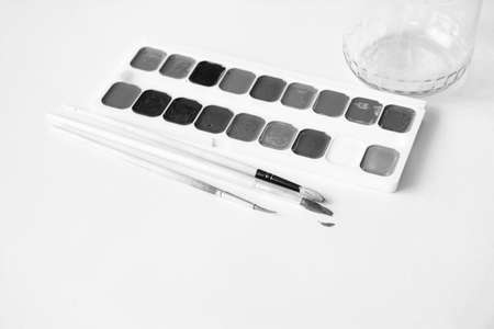 Close-up of watercolor palette. Children`s paint box. Black and white.