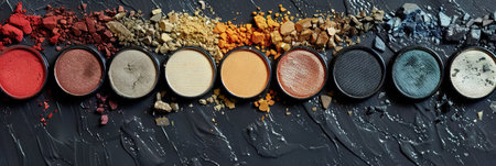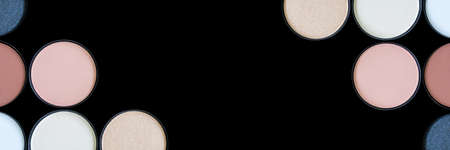 Beautiful colorful eyeshadow palette on black background isolated. Banner. Makeup. Beauty product. Decorative cosmetic. Brown eye shadow. Flat lay. Closeup. Place for text and design. Copy space.