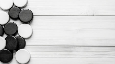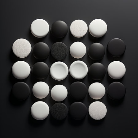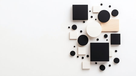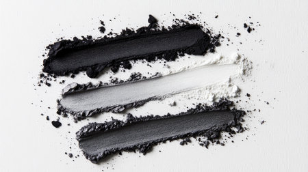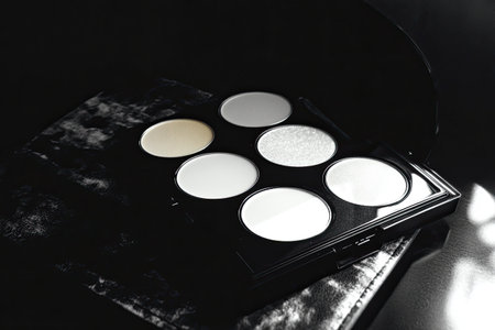 An elegant arrangement of monochromatic eyeshadow shades in black, gray, and white, on a minimal white canvas.