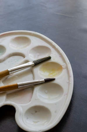 Artistic brushes and a washed Platonic paint palette on a dark table. Cleaning and restoring order at the training site. Creativity, hobbies, education. Side view at an angle. Selective focus.