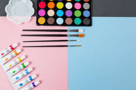 watercolors and brushes on a pink and blue paper background. top view. a set for a young artist. the concept of children's creativity