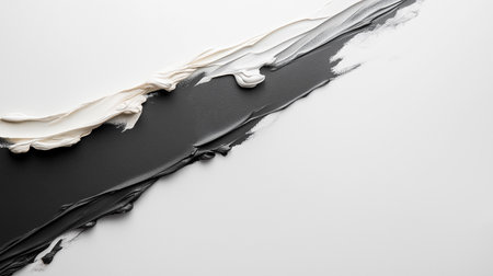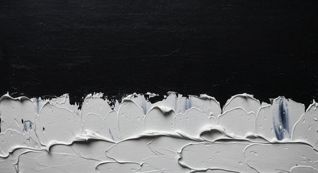 This close-up abstract composition showcases bold, creamy white paint strokes forming a textured border against a deep, matte black upper section, offering excellent copy space.