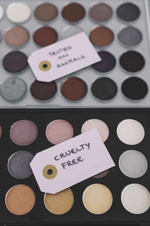 cruelty free vs animal tested cosmetics concept, eyeshadow palettes with text on labels