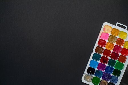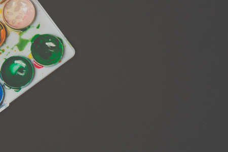 Used palette of watercolor paints. Materials for creativity. Top view with copy space, flat lay