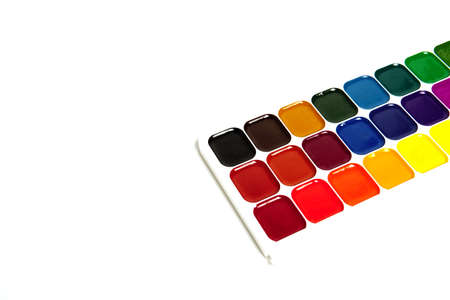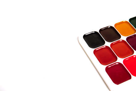 Watercolor paints and brushes, top view. Hobbies and creativity. white background. Set of colorful paints palette