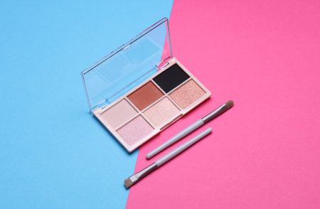 Makeup eyeshadow palette and brushes on blue pink background