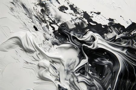 A spill of black oil paint with drops and splashes on a white background. Abstract background for the design. The painting depicts a wave in black and white. The black and white colors give the painting a timeless look.