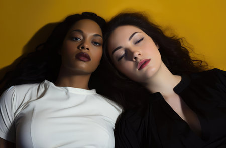 An AI-generated illustration of two beautiful women of different ethnicities sharing an intimate moment