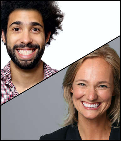 This composite image presents close-up portraits of two individuals, each with a bright smile. The composition highlights the juxtaposition of different skin tones and facial features. The soft lighting and shallow depth of field draw focus to the expressions. Suitable for use in projects related to diversity and positive emotions.
